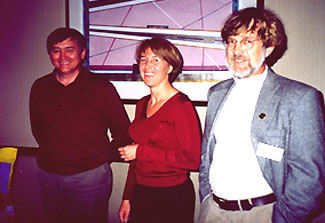 Below: Rafael Akkmetov (on left), Director of Ecocom Ltd environmental consulting company in Almaty, shares a humorous moment with ECOLOGIA's Heather McGray and Randy Kritkausky after their presentation on Environmental Management Systems.